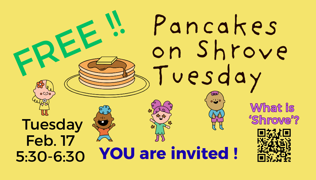 FREE pancakes have a spiritual foundation. For centuries, the time leading into Easter has been a time of reflection including fasting. Frequently that included fasting from fats & pancakes are a great way to get rid of fats! “Shrove” comes from an old English word meaning to confess and receive absolution.